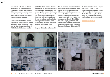 Neben den Kunst-Werken in der Auguststraße gehören noch fünf weitere Orte zu diesjährigen Berlin Biennale, darunter das leer stehende Kaufhaus am Kreuzberger Oranienplatz, eine Lagerhalle und die Alte Nationalgalerie. Es gibt auch sonst viel zu entdecken. Überall in Kreuzberg sieht man die schwarz-weiß Plakate mit Frauen, die nur in Ausschnitten zu sehen sind. Michael Schmidt hat sie im städtischen Raum inszeniert, dessen Fotoserie „Grau als Farbe“ zurzeit auch im Münchener Haus der Kunst zu sehen ist.