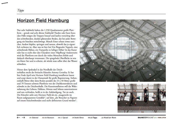 Hinter dem Spektakel in der Nordhalle der Deichtorhallen steckt der britische Künstler Antony Gormley. Er hat hier Ende April sein Horizon Field Hamburg installieren lassen und sorgt damit in der Hansestadt für große Begeisterung. Siebeneinhalb Meter über dem Boden pendelt die 25 x 50 Meter große und 70 Tonnen schwere Plattform von der Dachkonstruktion und schwebt in der Deichtorhalle. Die Kunstinstallation will die Wahrnehmung des Gehens, Fühlens, Hörens und Sehens umorientieren und neu verbinden, heißt es in der Ankündigung. Tut sie auch. Der Künstler sieht sein Horizon Field als ein „waagerecht im Raum aufgespanntes Gemälde“, auf dem „die Besucher zu Figuren auf einem freischwebenden und nicht definierten Grund werden“. Gormley beschäftigt sich schon lange mit dem Verhältnis des menschlichen Körpers zum Raum, seit 40 Jahren arbeitet er in seiner Kunst an diesem Thema.