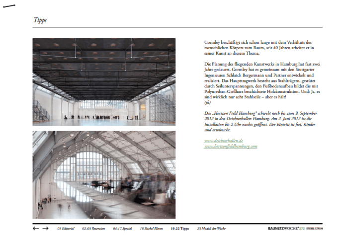 Die Planung des fliegenden Kunstwerks in Hamburg hat fast zwei Jahre gedauert, Gormley hat es gemeinsam mit den Stuttgarter Ingenieuren Schlaich Bergermann und Partner entwickelt und realisiert. Das Haupttragwerk besteht aus Stahlträgern, gestützt durch Seilunterspannungen, den Fußbodenaufbau bildet die mit Polyurethan-Gießharz beschichtete Holzkonstruktion. Und: Ja, es sind wirklich nur acht Stahlseile – aber es hält! (jtkn)