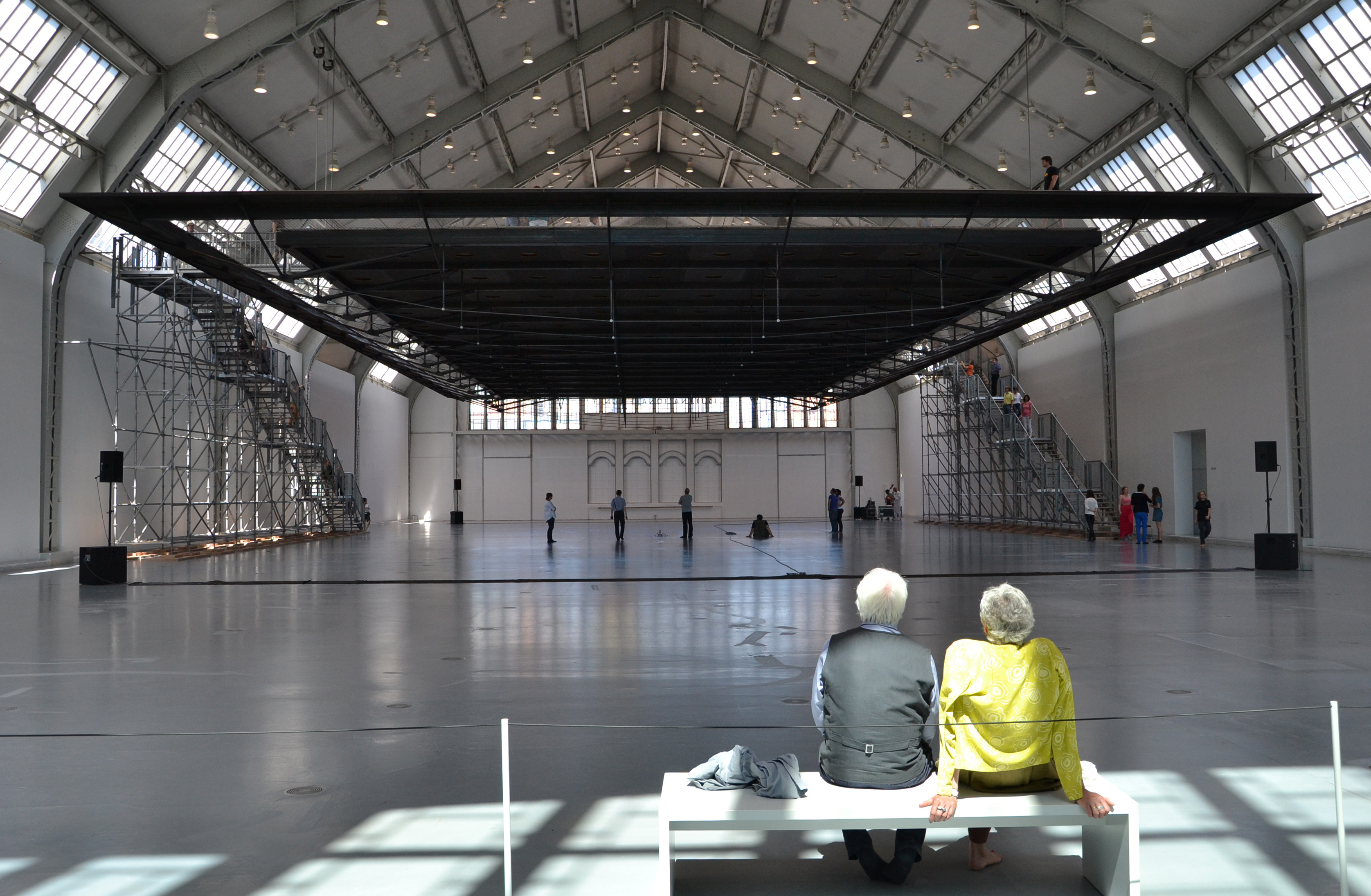 Nur acht Stahlseile halten die 1.250 Quadratmeter große Plattform – gerade mal acht dünne Stahlseile! Nackte oder bunt besockte Füße steigen die Treppen hinauf und laufen vorsichtig über den schwebenden, dunkel glänzenden Boden, der bei jeder Bewegung ein bisschen mitschwingt. Manch Einer schaut etwas unsicher, Andere huüpfen, springen und tanzen, obwohl das ja eigentlich verboten ist. Aber was ist hier los? Ein fliegender Teppich, eine schwebende Bühne, ein Trampolin in luftiger Höhe? Ist das Kunst oder hat es nicht eher den Charakter einer Hüpfburg? Andererseits wird die Plattform erst durch die vielen Menschen belebt und dadurch überhaupt interessant. Die spiegelnde Oberfläche ist wie ein klarer See und es scheint, als würde man selbst über das Wasser schweben…