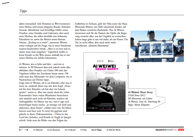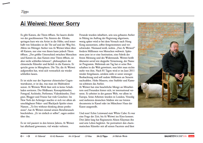 40 Katzen, nur eine von ihnen kann jedoch Türen öffnen. „Der größte Unterschied zwischen Menschen und Katzen ist, dass Katzen zwar Türen öffnen, sie aber nicht schließen können“, philosophiert der chinesische Künstler und lächelt in die Kamera. Er spricht gerne in Metaphern. Die Tür, die Ai Weiwei aufgestoßen hat, wird sich vermutlich nie wieder schließen lassen.