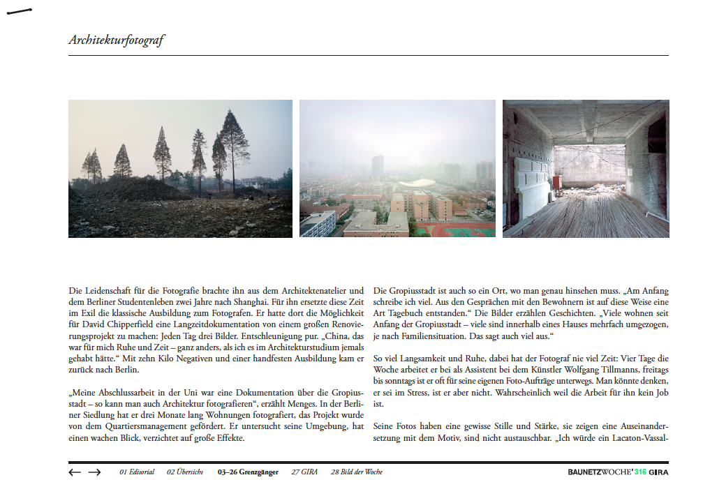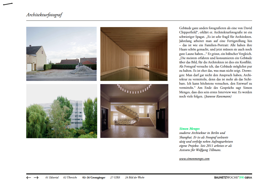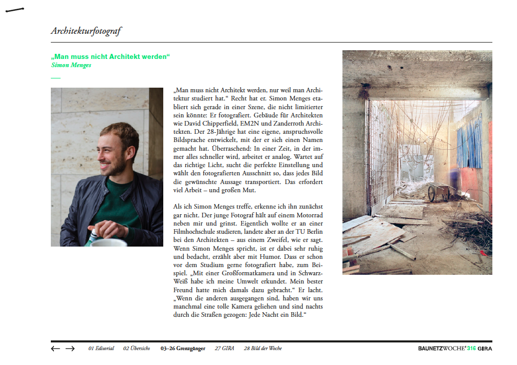 „Man muss nicht Architekt werden, nur weil man Architektur studiert hat.“ Recht hat er. Simon Menges etabliert sich gerade in einer Szene, die nicht limitierter sein könnte: Er fotografiert. Gebäude für Architekten wie David Chipperfield, EM2N und Zanderroth Architekten. Der 28-Jährige hat eine eigene, anspruchsvolle Bildsprache entwickelt, mit der er sich einen Namen gemacht hat. Überraschend: In einer Zeit, in der immer alles schneller wird, arbeitet er analog. Wartet auf das richtige Licht, sucht die perfekte Einstellung und wählt den fotografierten Ausschnitt so, dass jedes Bild die gewünschte Aussage transportiert. Das erfordert viel Arbeit – und großen Mut. (…)