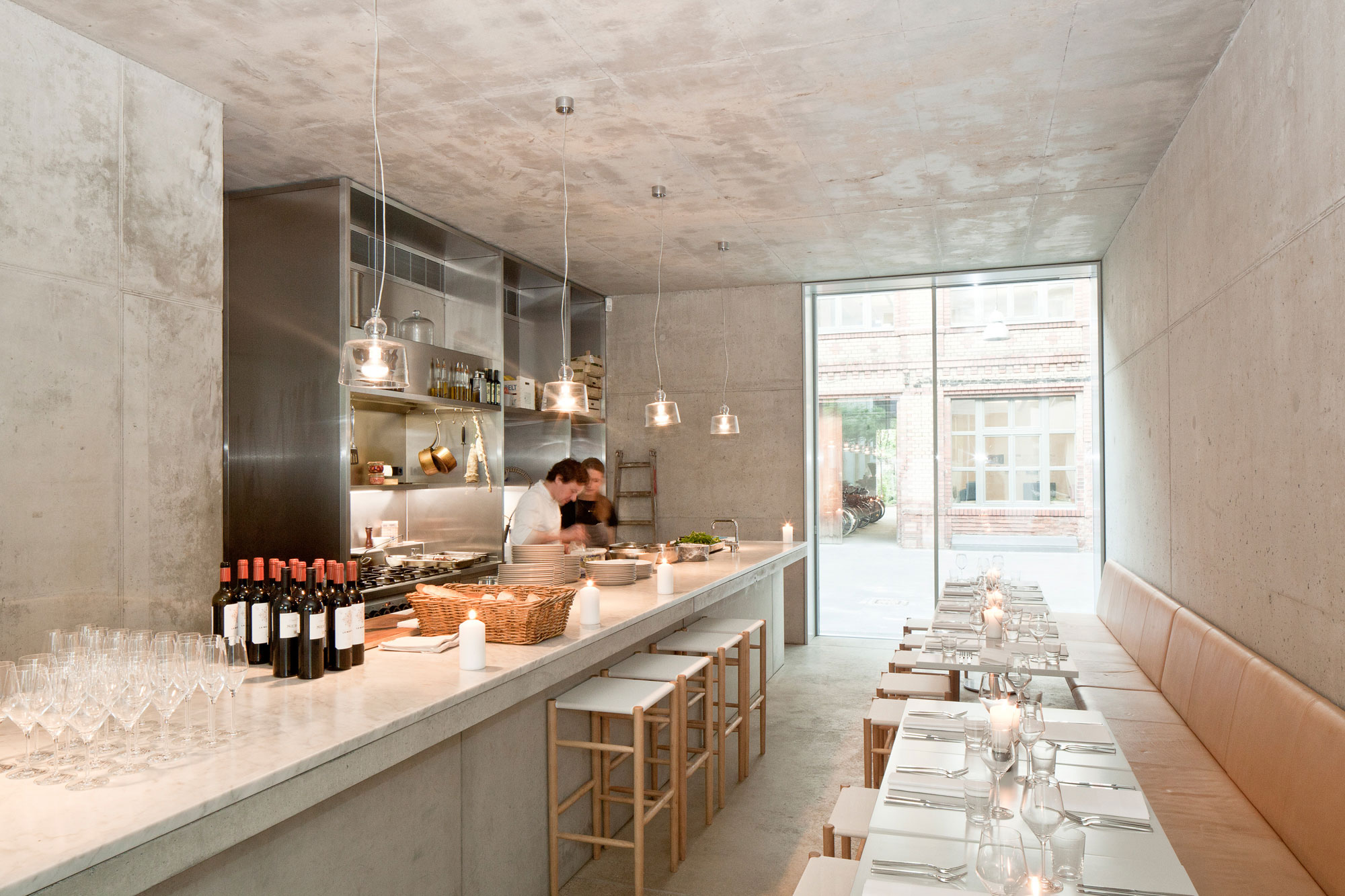 Ähnlich wie die alte Kantine hat auch der Neubau hohe Wände und Decken. Ein zehn Meter langer Tresen aus Marmor teilt das offene Erdgeschoss der neuen Kantine in Küche und Speisebereich – man darf den Köchen also in die Töpfe gucken. Auf der gegenüberliegenden Längsseite sind Sitzbänke und Tische angeordnet; weitere Tische befinden sich im oberen Geschoss. Eine Referenz aus Japan verbirgt sich schließlich doch noch in der neuen Kantine. Die dezenten Stühle und Barhocker aus Holz von dem japanischen Möbelhersteller Maruni bringen Gemütlichkeit in den Betonkubus; sie wurden von Jasper Morrison entworfen. Tische, Bänke und der Tresen stammen von den Architekten.