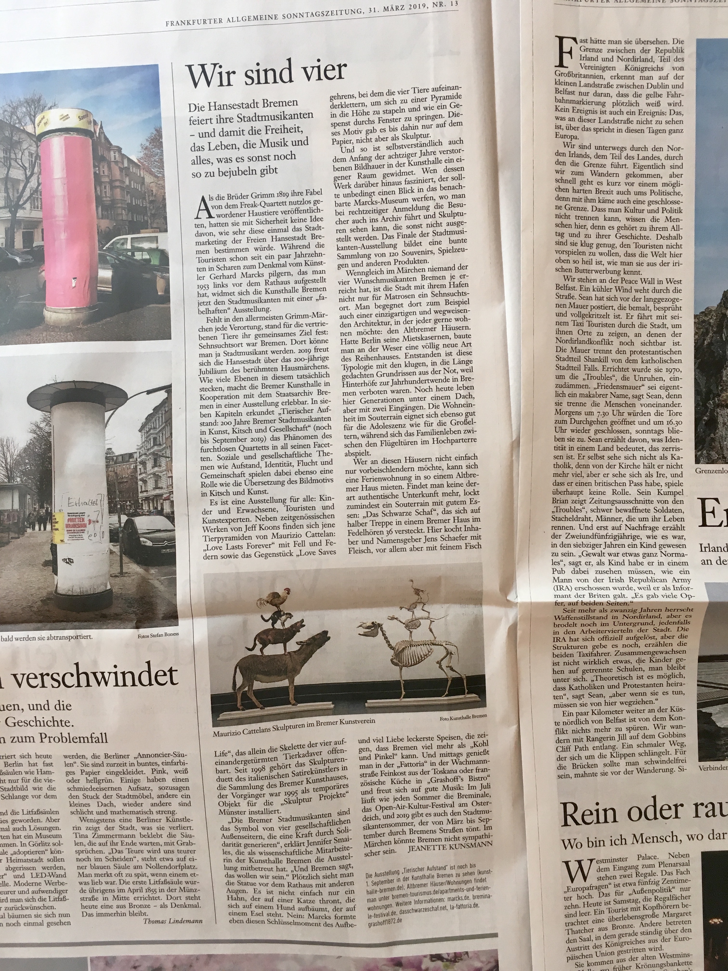 Die Hansestadt Bremen feiert ihre Stadtmusikanten – und damit die Freiheit, das Leben, die Musik und alles, was es sonst noch zu bejubeln gibt. – erschienen in der Frankfuter Allgemeinen Sonntagszeitung