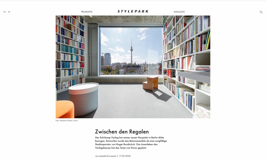 Der Suhrkamp Verlag hat seinen neuen Hauptsitz in Berlin-Mitte bezogen. Entworfen wurde das Betonensemble als eine sorgfältige Stadtreparatur von Roger Bundschuh. Das Innenleben des Verlagshauses hat das Team von Kinzo geplant. (…) Die konisch geformten Etagengrundrisse ergeben sich aus der stadtplanerischen Setzung – die Architektur erinnert selbst an eine überdimensionale doppelte Regalreihe. Roger Bundschuh geht es dabei, wie schon zuvor beim benachbarten L40, um eine Auflösung des Blockrands. Das neue Haus soll eben nicht wie der Poelzig-Bau sein, der an dieser Stelle einmal stand, sagt Bundschuh, sondern das genaue Gegenteil: „Kein Blockrand, kein enger Hinterhof.“ Stattdessen öffnet sich sein Entwurf zum Rosa-Luxemburg-Platz und zur Linienstraße. „Es gibt keine Schauseite und keine Rückseite, der städtische Raum umgibt das Gebäude.“ Während die dunkle Fassade des L 40 gegenüber als markanter Monolith den Stadtraum bespielt, bezieht sich der Suhrkamp-Neubau mit seiner hellen, warmen Betonfassade in Form und Farbigkeit auf den Bühnenturm der Volksbühne. Noch sind die Außenanlagen nicht endgültig fertiggestellt. Im Innern wird dagegen bereits am nächsten Kapitel der Geschichte des Suhrkamp-Verlages geschrieben.
