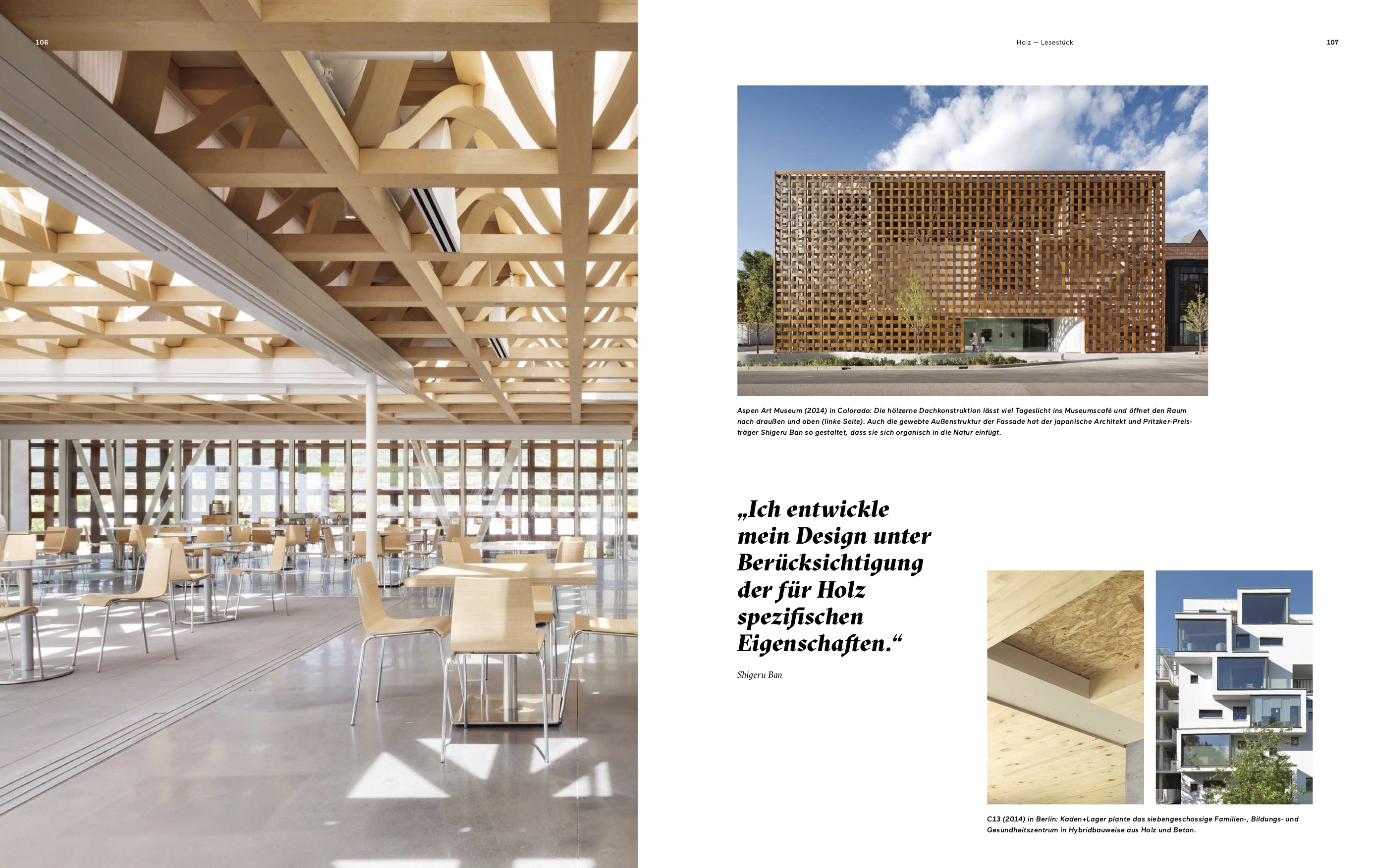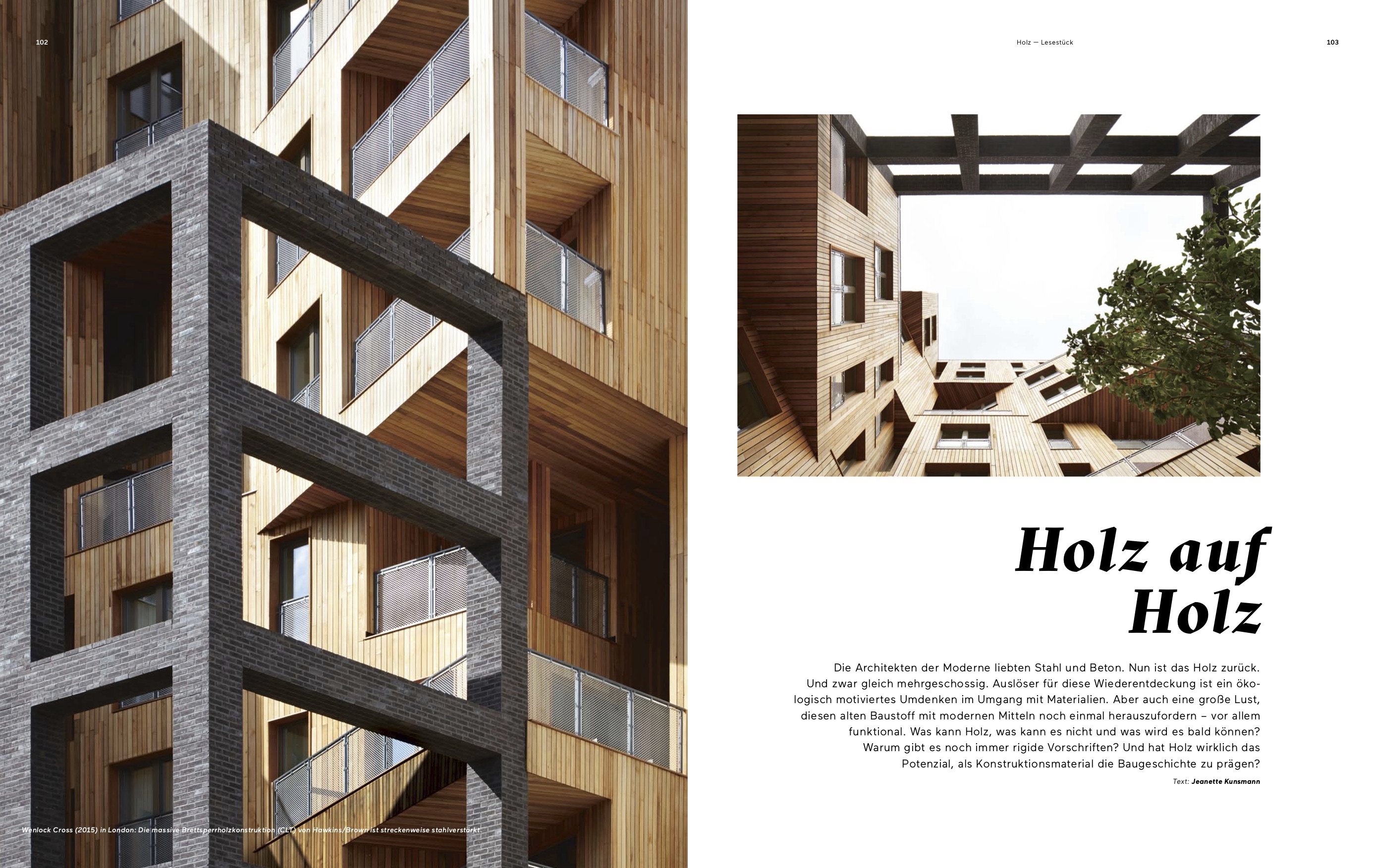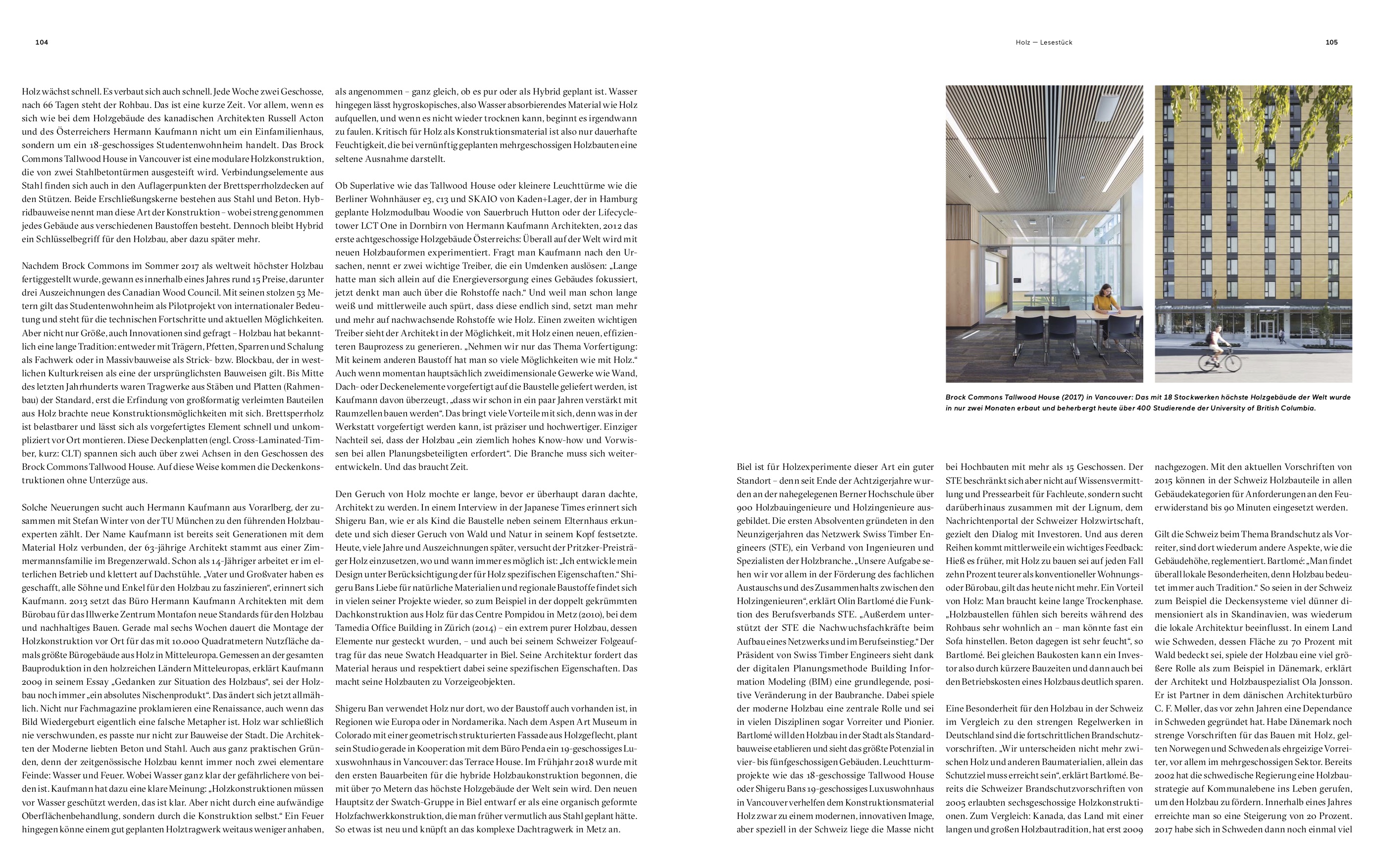 Solche Neuerungen sucht auch Hermann Kaufmann aus Vorarlberg, der zusammen mit Stefan Winter von der TU München zu den führenden Holzbauexperten zählt. Der Name Kaufmann ist bereits seit Generationen mit dem Material Holz verbunden, der 63-jährige Architekt stammt aus einer Zimmermannsfamilie im Bregenzerwald. Schon als 14-Jähriger arbeitet er im elterlichen Betrieb und klettert auf Dachstühle. „Vater und Großvater haben es geschafft, alle Söhne und Enkel für den Holzbau zu faszinieren“, erinnert sich Kaufmann. 2013 setzt das Büro Hermann Kaufmann Architekten mit dem Bürobau für das Illwerke Zentrum Montafon neue Standards für den Holzbau und nachhaltiges Bauen. Gerade mal sechs Wochen dauert die Montage der Holzkonstruktion vor Ort für das mit 10.000 Quadratmetern Nutzfläche da- mals größte Bürogebäude aus Holz in Mitteleuropa. Gemessen an der gesamten Bauproduktion in den holzreichen Ländern Mitteleuropas, erklärt Kaufmann 2009 in seinem Essay „Gedanken zur Situation des Holzbaus“, sei der Holzbau noch immer „ein absolutes Nischenprodukt“. Das ändert sich jetzt allmählich. Nicht nur Fachmagazine proklamieren eine Renaissance, auch wenn das Bild Wiedergeburt eigentlich eine falsche Metapher ist. Holz war schließlich nie verschwunden, es passte nur nicht zur Bauweise der Stadt. Die Architekten der Moderne liebten Beton und Stahl. Auch aus ganz praktischen Gründen, denn der zeitgenössische Holzbau kennt immer noch zwei elementare Feinde: Wasser und Feuer. Wobei Wasser ganz klar der gefährlichere von bei- den ist. Kaufmann hat dazu eine klare Meinung: „Holzkonstruktionen müssen vor Wasser geschützt werden, das ist klar. Aber nicht durch eine aufwändige Oberflächenbehandlung, sondern durch die Konstruktion selbst.“ Ein Feuer hingegen könne einem gut geplanten Holztragwerk weitaus weniger anhaben, als angenommen – ganz gleich, ob es pur oder als Hybrid geplant ist. Wasser hingegen lässt hygroskopisches, also Wasser absorbierendes Material wie Holz aufquellen, und wenn es nicht wieder trocknen kann, beginnt es irgendwann zu faulen. Kritisch für Holz als Konstruktionsmaterial ist also nur dauerhafte Feuchtigkeit, die bei vernünftig geplanten mehrgeschossigen Holzbauten eine seltene Ausnahme darstellt. (…)