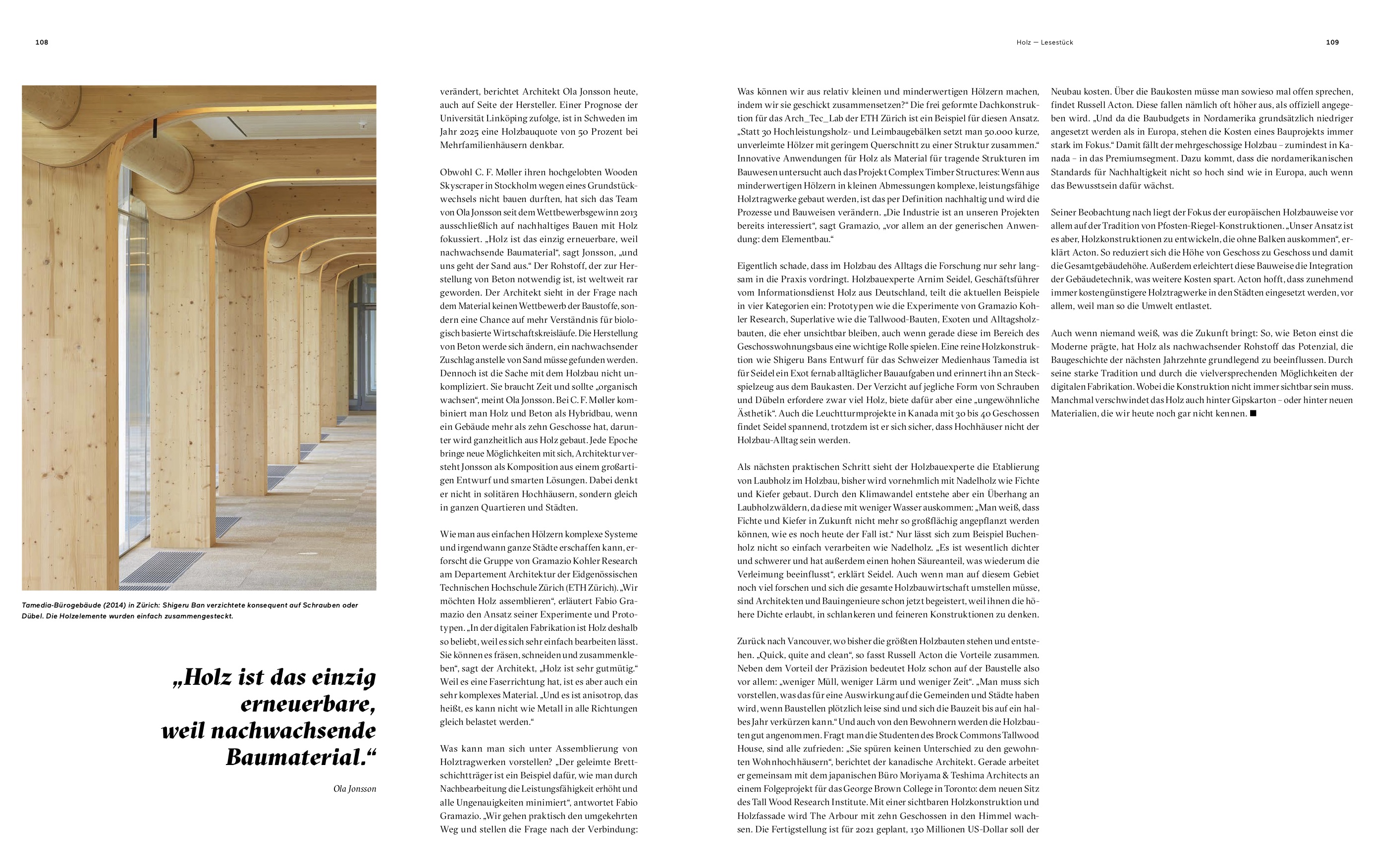 Als nächsten praktischen Schritt sieht der Holzbauexperte die Etablierung von Laubholz im Holzbau, bisher wird vornehmlich mit Nadelholz wie Fichte und Kiefer gebaut. Durch den Klimawandel entstehe aber ein Überhang an Laubholzwäldern, da diese mit weniger Wasser auskommen: „Man weiß, dass Fichte und Kiefer in Zukunft nicht mehr so großflächig angepflanzt werden können, wie es noch heute der Fall ist.“ Nur lässt sich zum Beispiel Buchen- holz nicht so einfach verarbeiten wie Nadelholz. „Es ist wesentlich dichter und schwerer und hat außerdem einen hohen Säureanteil, was wiederum die Verleimung beeinflusst“, erklärt Seidel. Auch wenn man auf diesem Gebiet noch viel forschen und sich die gesamte Holzbauwirtschaft umstellen müsse, sind Architekten und Bauingenieure schon jetzt begeistert, weil ihnen die höhere Dichte erlaubt, in schlankeren und feineren Konstruktionen zu denken. (…)